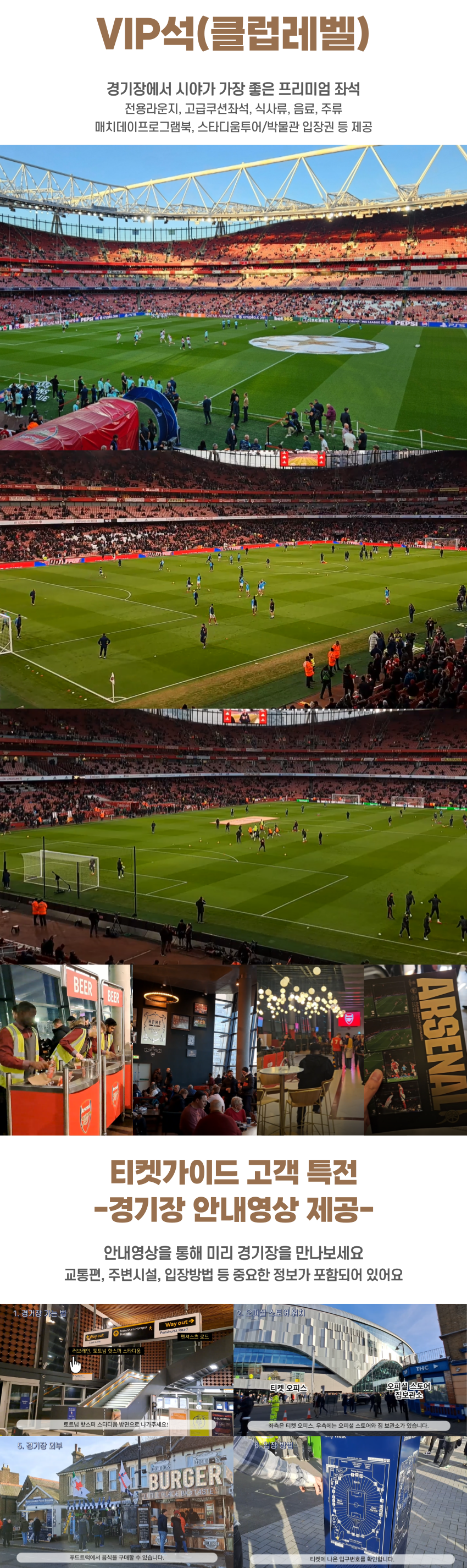 - 전용라운지, 고급쿠션좌석, 푸드(버거, 피자 등 식사류) 음료, 주류, 매치데이프로그램북(잡지), 스타디움투어 입장권 등 제공